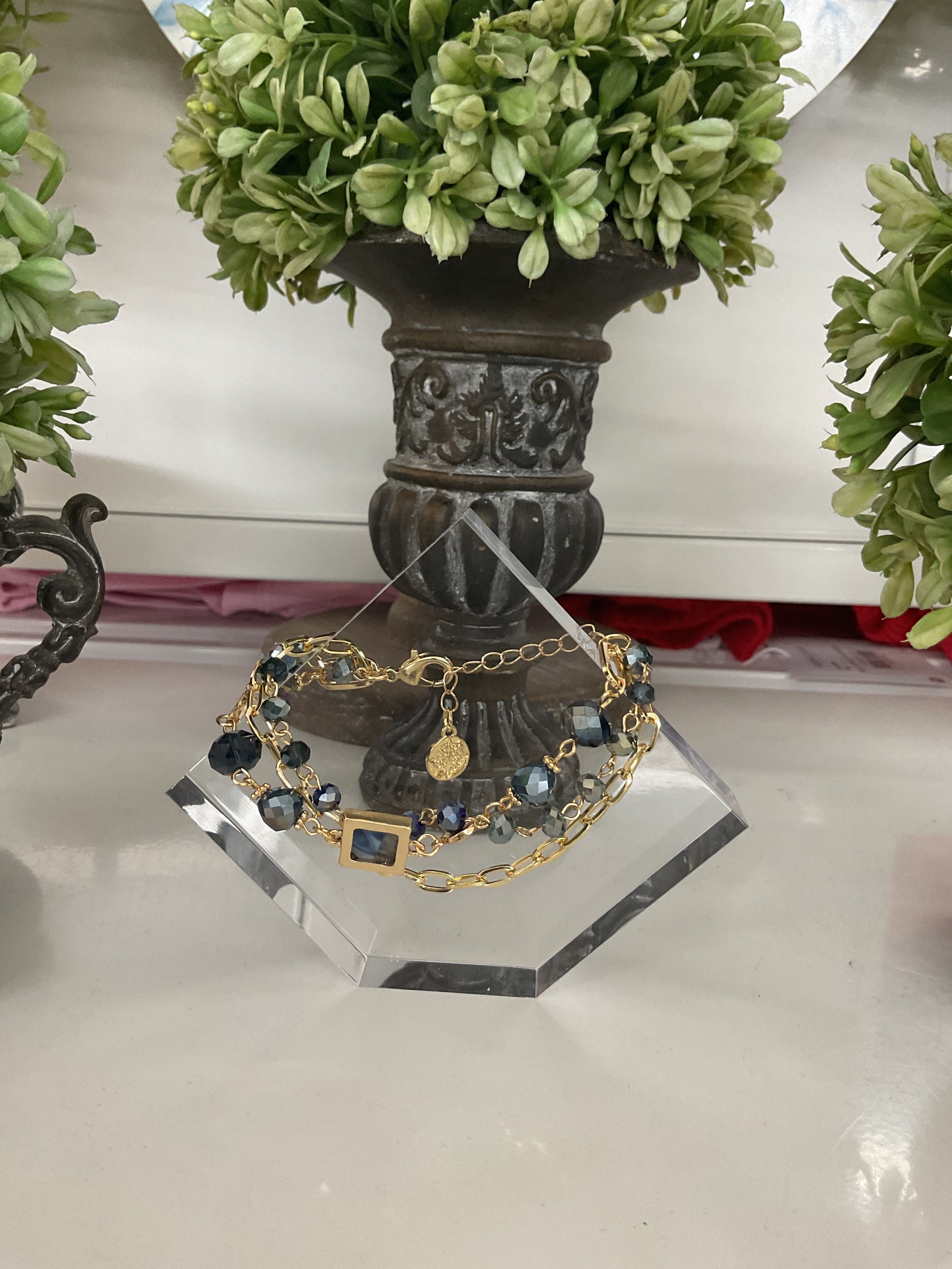 3 Strand Blue, Gold Beaded Link Bracelet with Blue and Natural Resin Square.