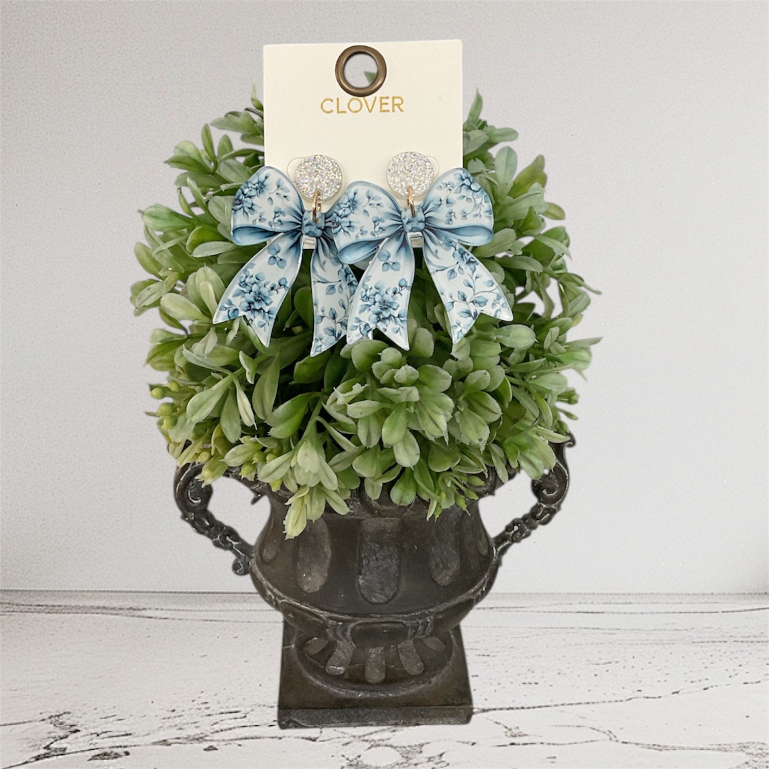 These adorable earrings feature sparkly studs topped with soft blue floral bows with silver top. Sweet, feminine, and perfect for adding a playful touch to any look.