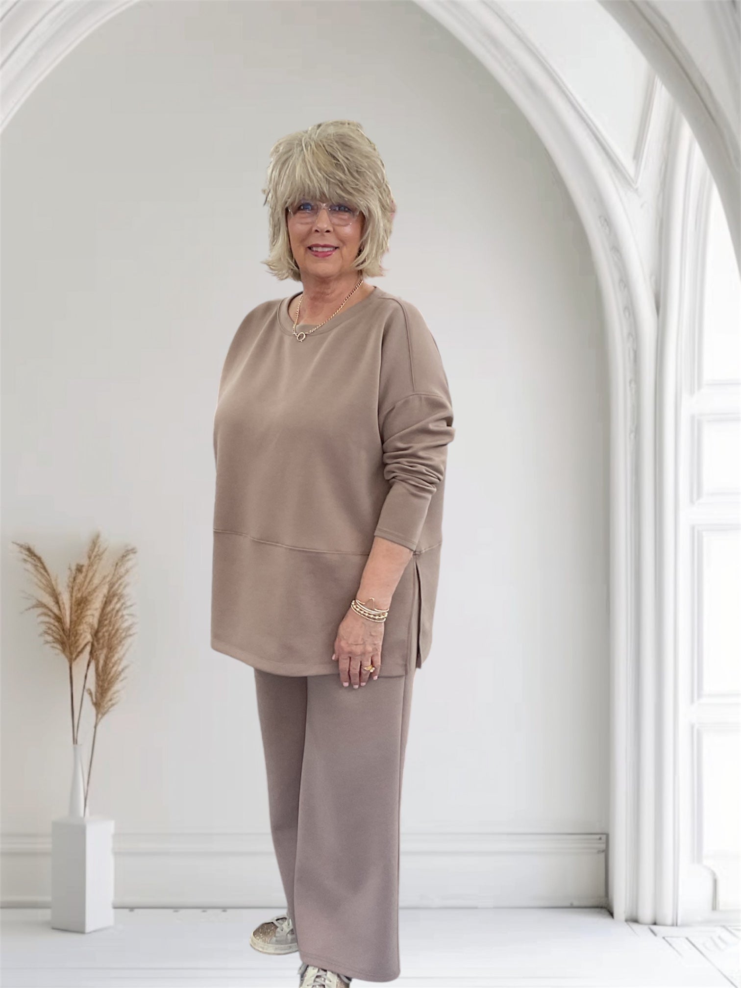 This long sleeve cappuccino set is scuba material and flowy pants. True To Size. 96% Polyester 4% Spandex