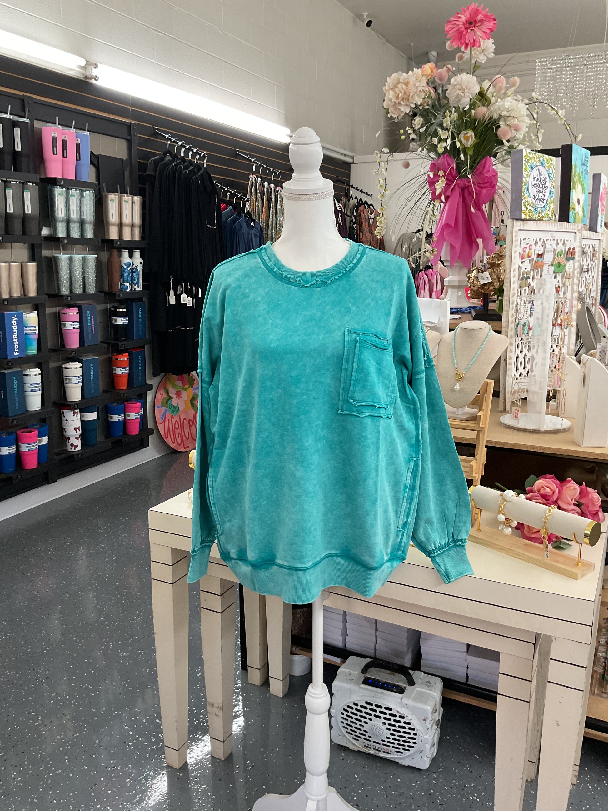 French Terry acid washed pullover with raw edges, front pocket, and pockets. 100% Cotton