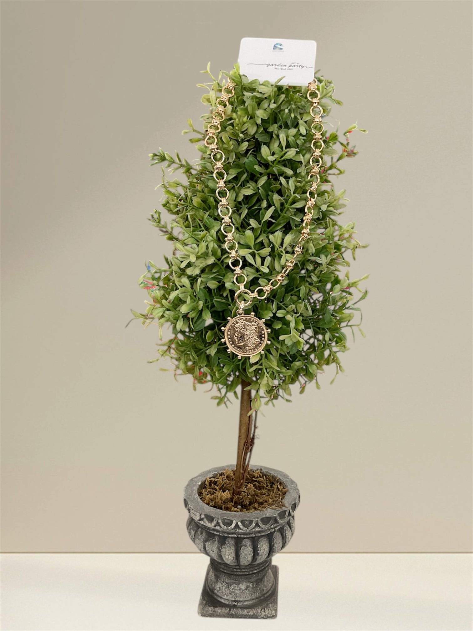 This chic gold chain necklace features bold circular links and a vintage-inspired coin pendant. A timeless statement piece perfect for any outfit.