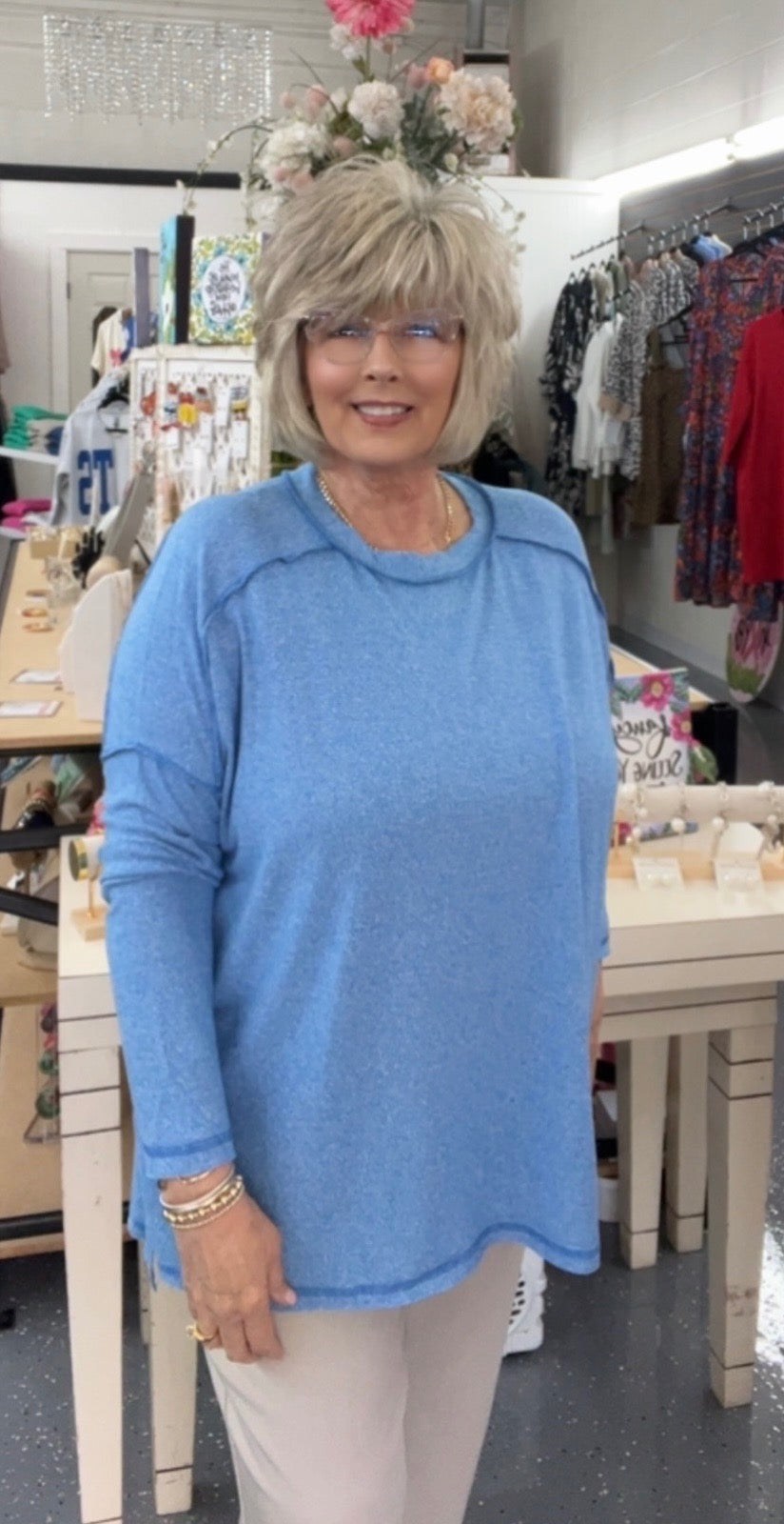 Soft Melange Hacci Exposed Seam Hi Low Tee in Ocean Blue. Dolman Sleeve. True to size. 95% Polyester 5% Spandex