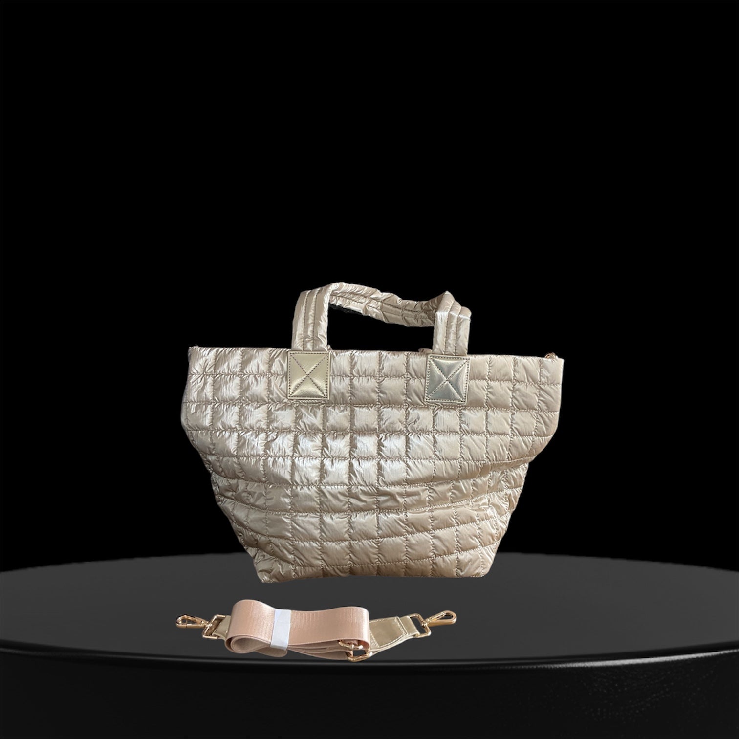Lightweight, luxe, and ready to turn heads — this quilted puff tote brings major style with zero effort. Featuring a glossy champagne finish, cozy padded texture, and detachable strap for crossbody convenience, it’s the perfect blend of fashion and function. Whether you’re headed to brunch or running errands, this bag adds a little sparkle to every step!
