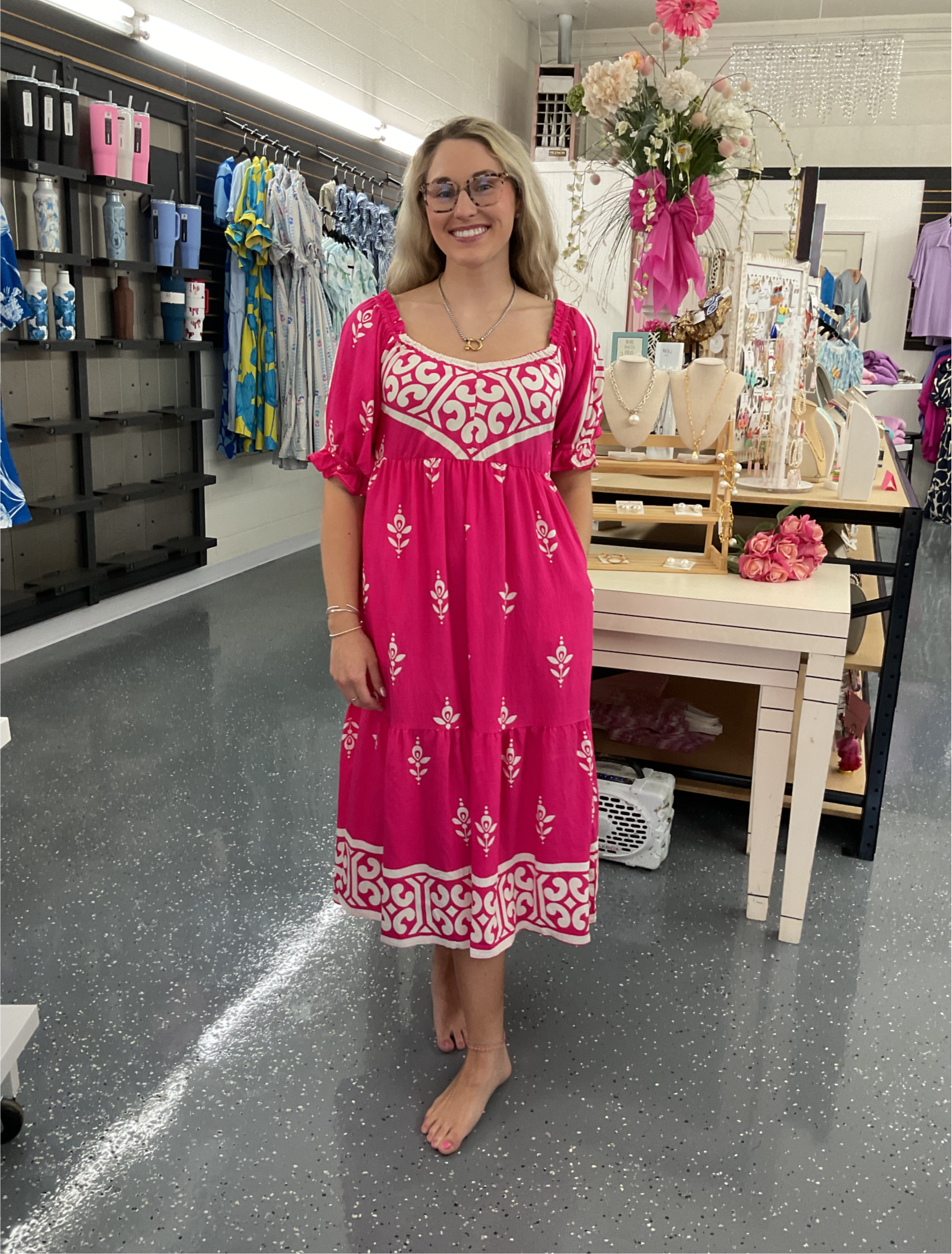 Bold and breezy, this vibrant pink dress features elegant white embroidery, puff sleeves, and a flowy tiered silhouette. This Pink Sangria Dress is fitting true to size.