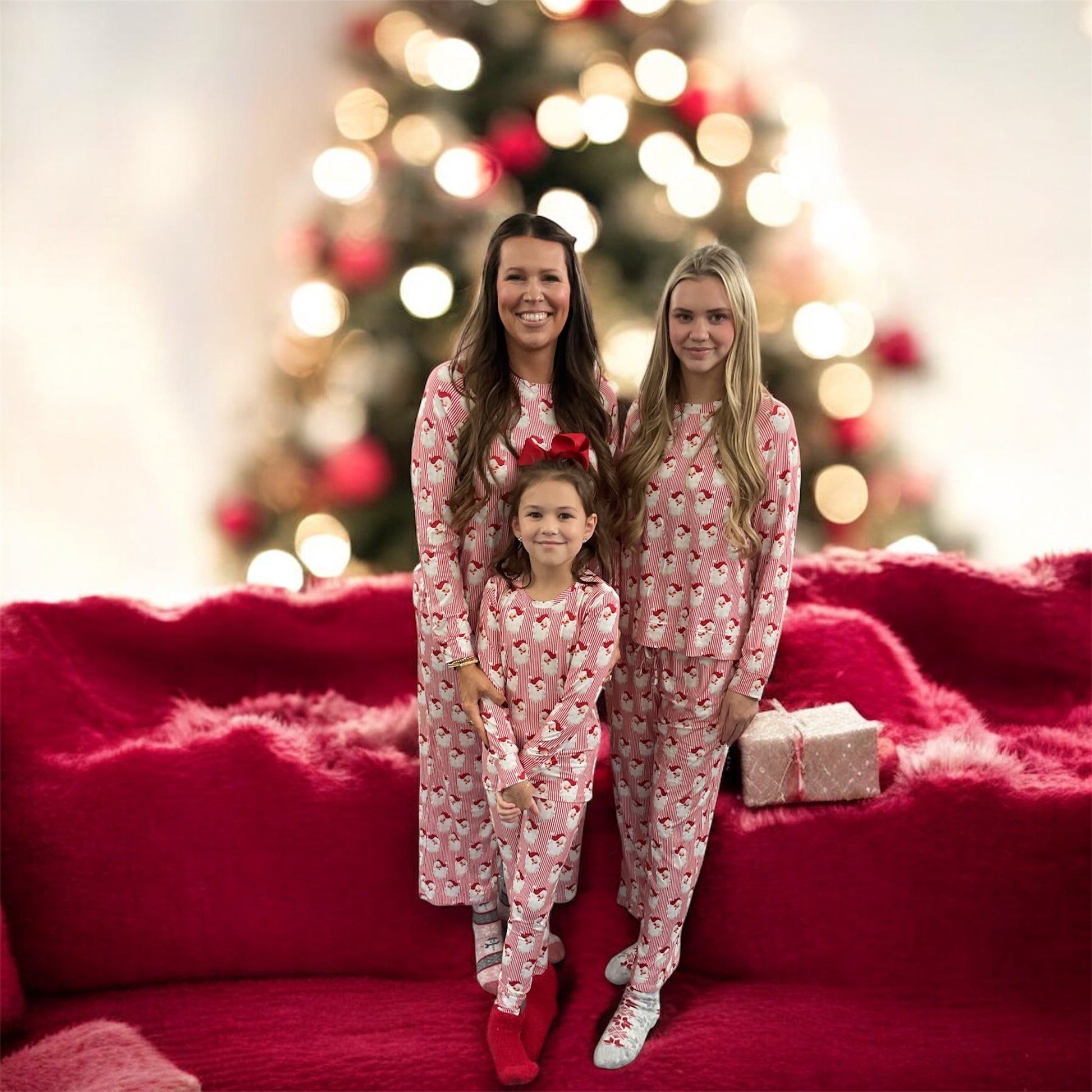 Each piece features a soft blush-pink base patterned with cute white penguins in Santa hats, giving it that perfect mix of cozy and festive. The fabric looks lightweight and buttery-soft, ideal for lounging by the fire or opening presents Christmas morning.