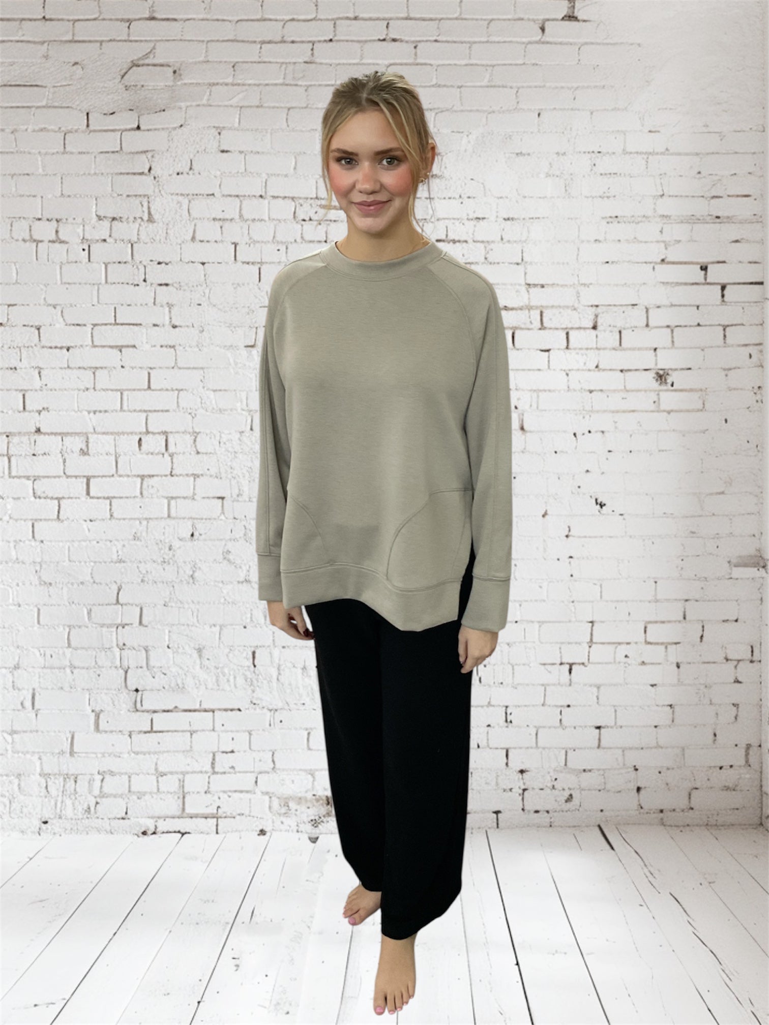 Scuba round neck pullover with side slits. Oversized. 90% Polyester 6% Rayon 4% Spandex