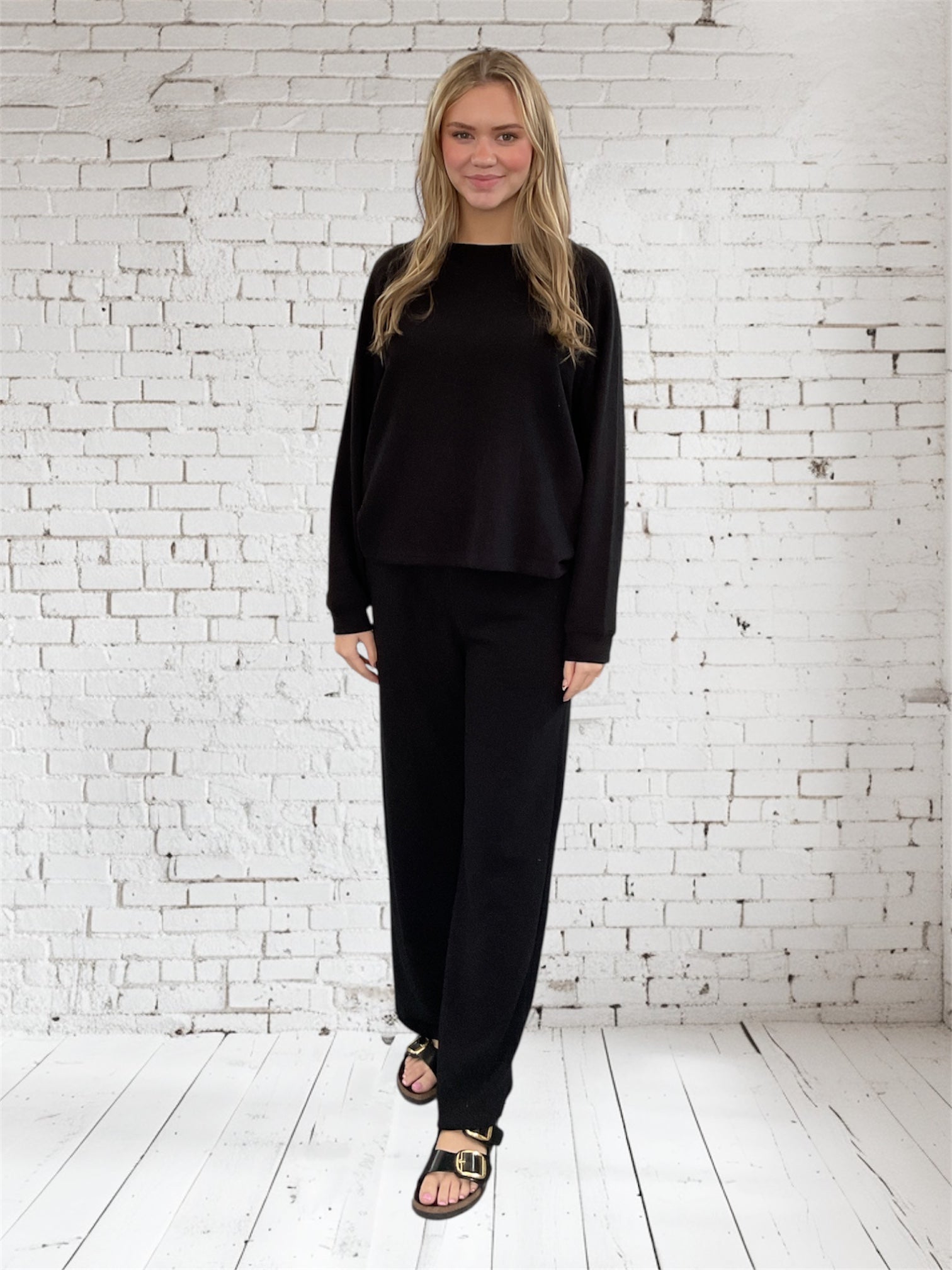 A casual textured long sleeve top and pants. Slightly oversized. 59% cotton 39% Polyester 2% Spandex.