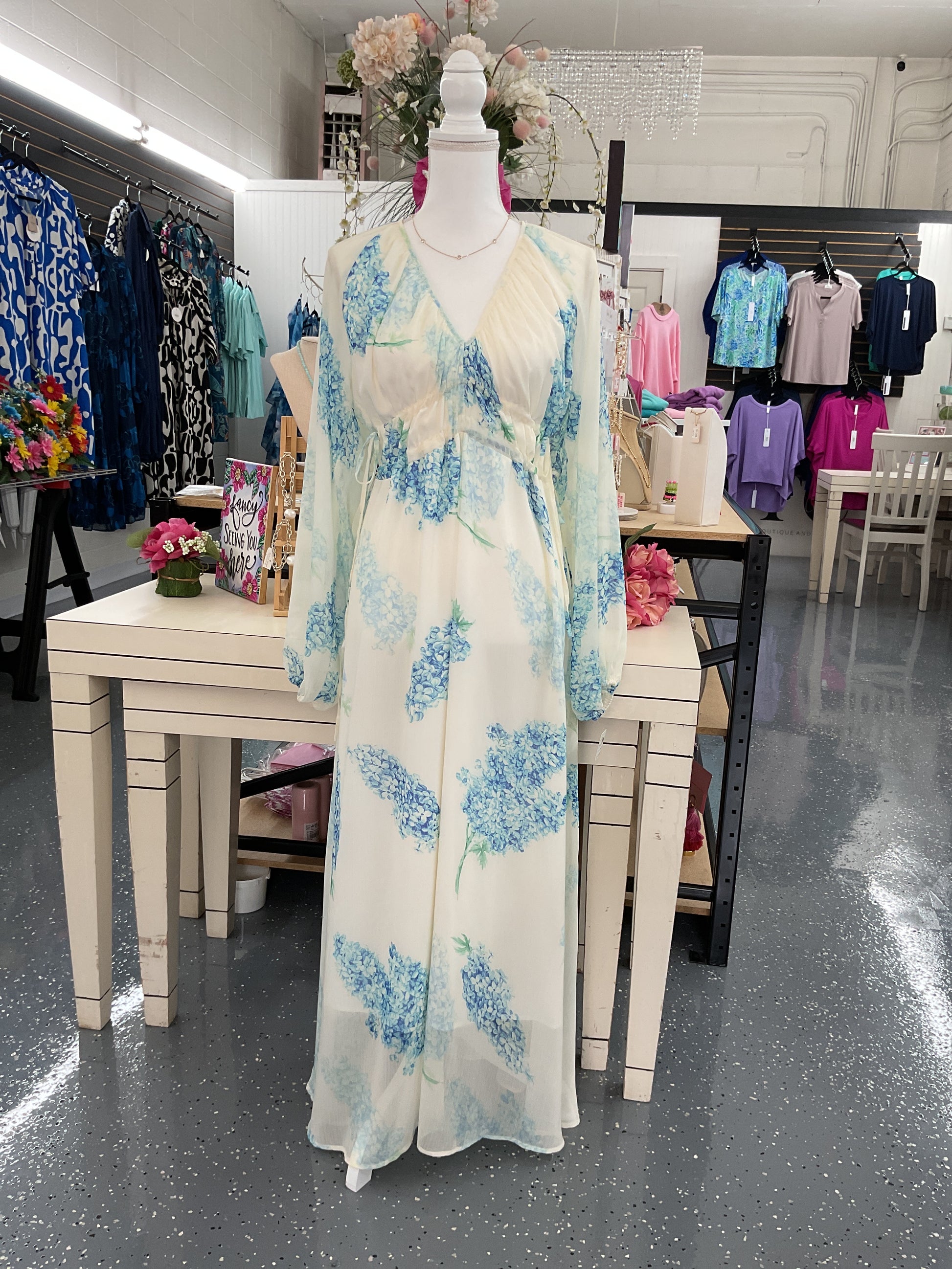 Soft and romantic, the Hydrangea Bloom dress features delicate blue floral prints on a creamy background with dreamy sheer sleeves and a flattering empire waist. This dress is fitting true to size . 95% Polyester 5% Elastane
