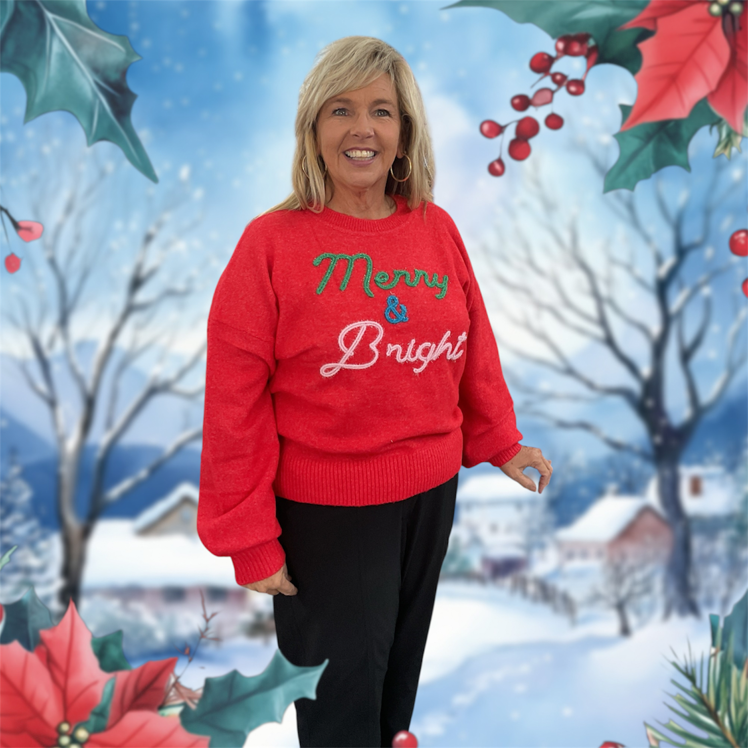 This red sweater features a stitched Merry in green and Bright in a light pink. This festive sweater is fitting true to size.